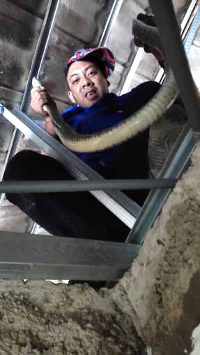 Salah seorang Tim Pemadam Kebakaran (Damkar) Kabupaten Malang, Jawa Timur, menunjukkan ular yang masuk ke dalam rumah warga di Perumahan...